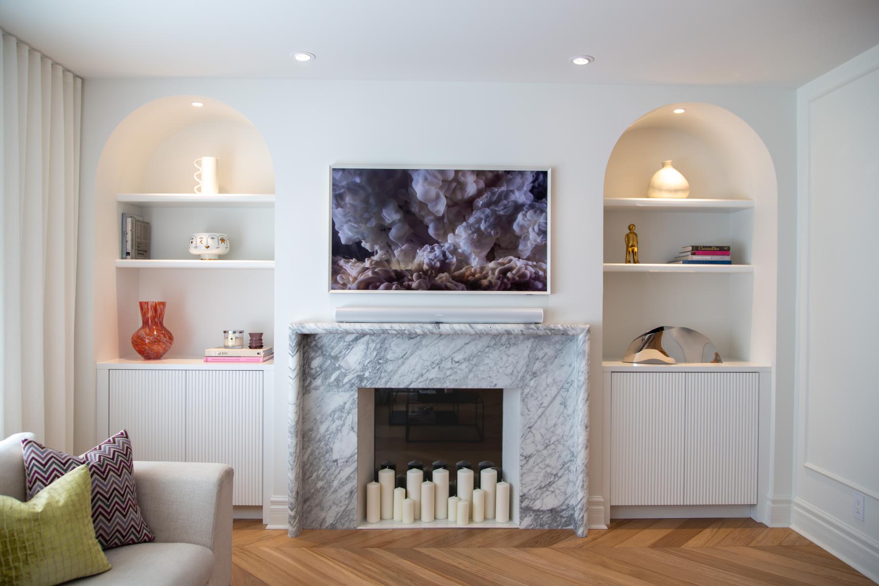 Le rangement a été étudié avec des solutions sur mesure, dans le but de maintenir l’espace dégagé et ordonné, tout en contribuant à l’esthétique globale du projet. Dans la cuisine, les équipements sélectionnés pour leur performance ont été dissimulé dans l’ébénisterie, afin de minimiser leur présence. Conçu à l’image d’un meuble d’appoint, l’îlot se distingue par sa délicatesse avec ses courbes et ses cannelures. Il optimise à la fois la capacité de rangement et la surface de travail, tout en préservant une circulation ergonomique. Le rangement est également maximisé dans le coin dinette, alors que des tiroirs ont été prévus sous la banquette. Dans la salle familiale, les bibliothèques de part et d’autre du foyer ont été traitées avec symétrie. Visible dès l’entrée, elles traduisent une volonté d’ordre et de maîtrise, tout en laissant place à des éléments décoratifs qui réchauffe la composition.