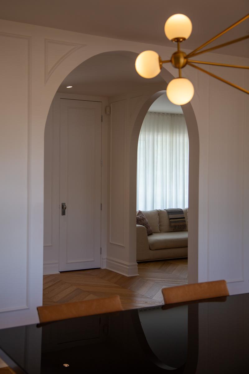Au niveau de l’aménagement, plutôt que de miser sur une disposition à aire ouverte, le rez-de-chaussée a été travaillé de façon à offrir de l’intimité entre les différentes pièces. La succession des espaces, reliés par des passages en arche, instaure un jeu de perspective et de profondeur, tout en préservant une séparation visuelle. Cette organisation offre à chaque membre de la famille la possibilité d’investir un lieu où les différentes activités peuvent coexister sans interférer. À l’étage, cette même notion d’intimité a été renforcée par une séparation claire entre la suite parentale et les espaces réservés aux enfants.