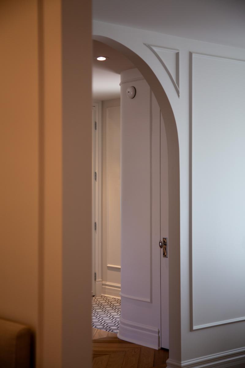 Le choix des matériaux et les détails de finition qui caractérisent le projet, tendent vers une harmonie esthétique entre tradition et modernité. L’ensemble s’inscrit dans une facture classique, bien que la composition générale reste sobre, raffinée et résolument actuelle. Par l’intégration de pierre naturelle, la présence du parquet en chevrons ou encore par le jeu de moulures, on perçoit une inspiration classique, qui est ici réinterprétée dans une facture contemporaine. Une approche qui s’efforce de marier sobriété, élégance et fonctionnalité, dans un dialogue constant entre passé et présent.