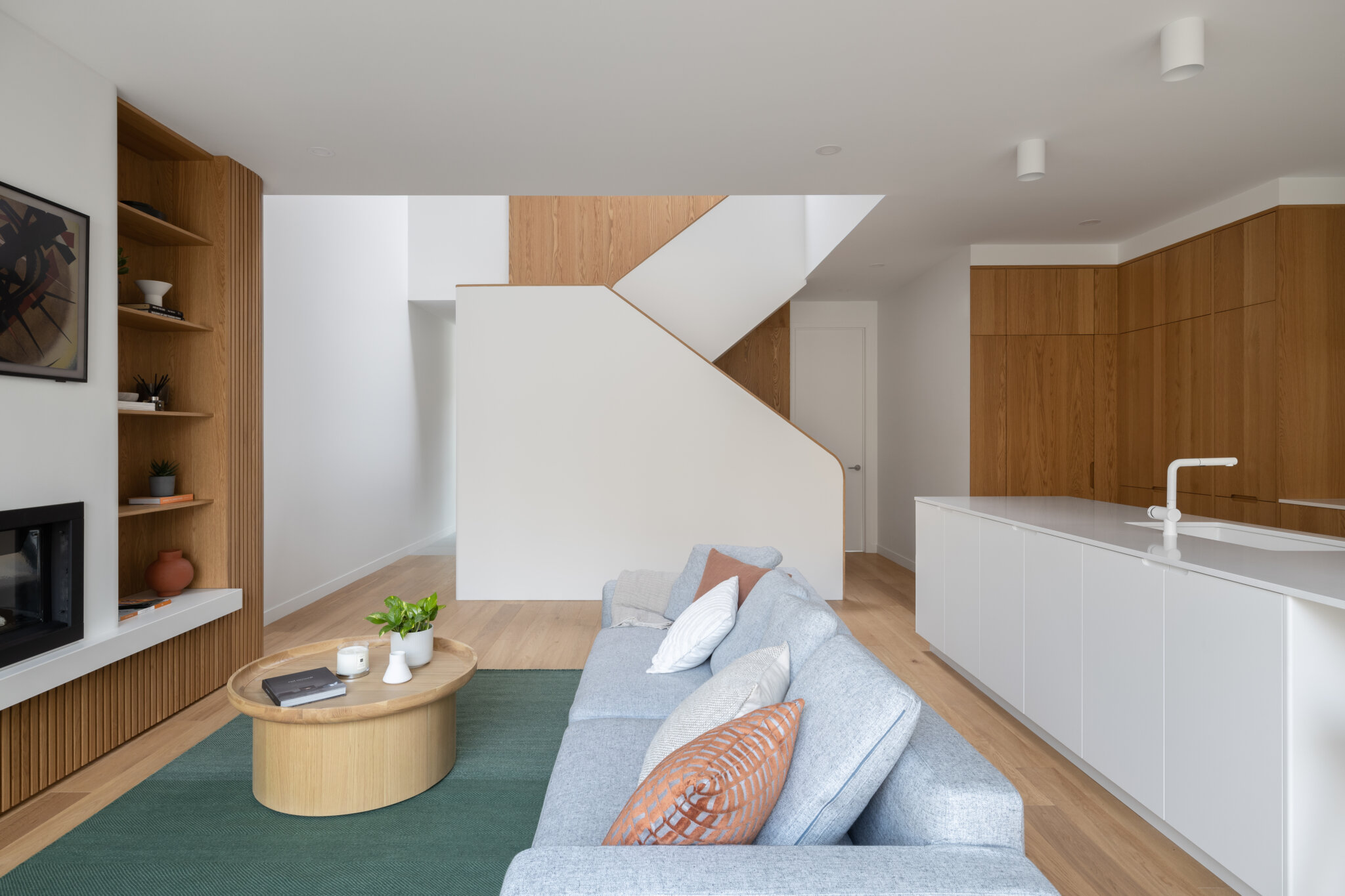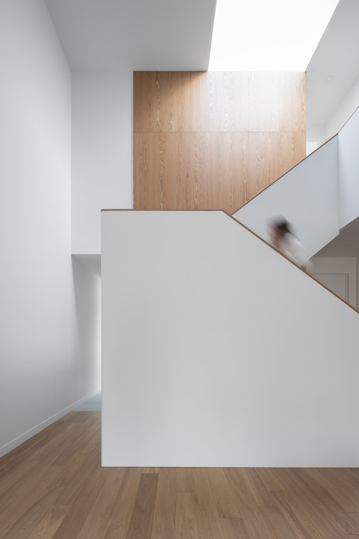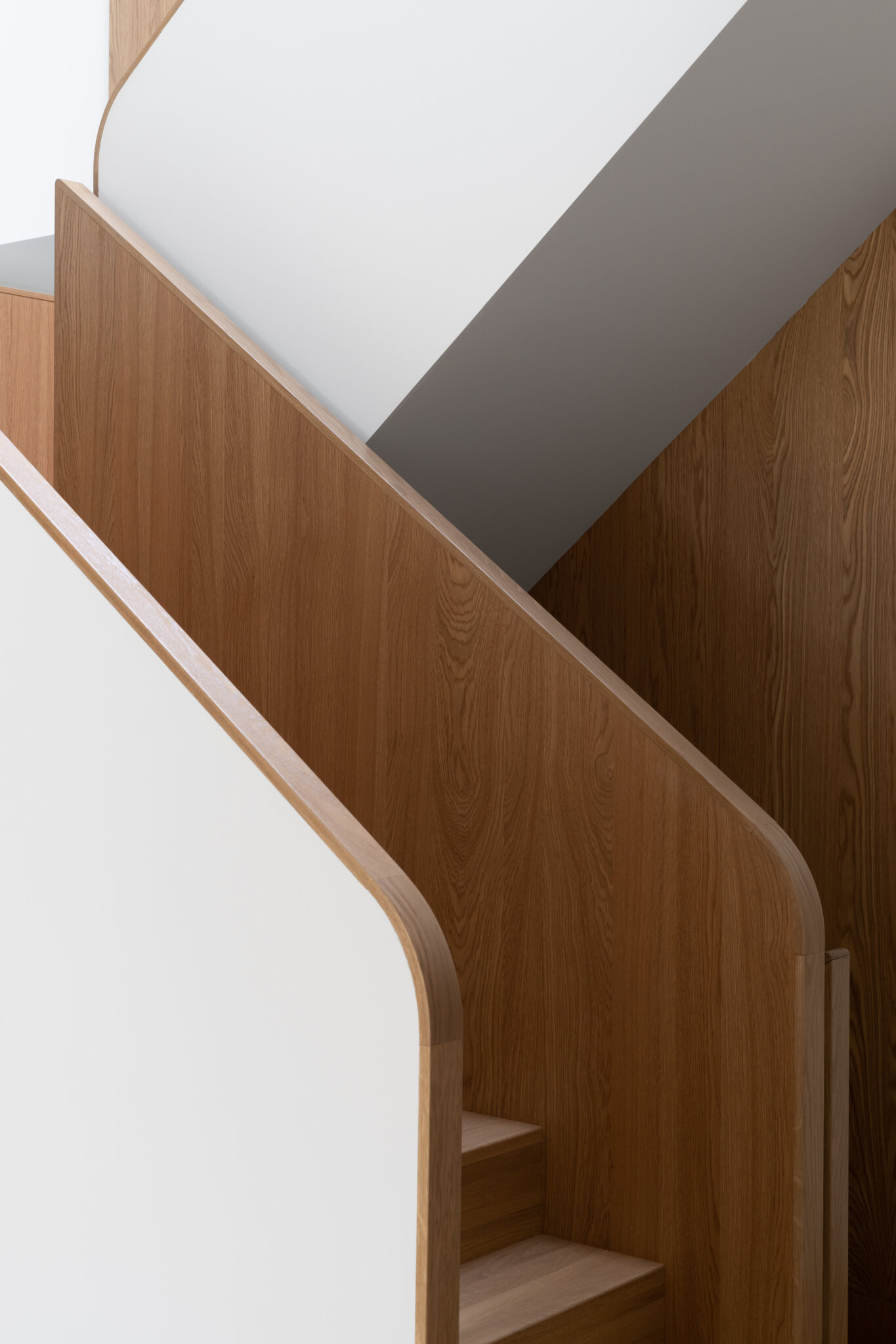 Au centre de la résidence se retrouve un escalier majestueux. Son enveloppe blanche agit comme pièce d’art dans l’espace, tandis que le noyau en bois contrastant et chaleureux évoque le parcours entre tous les niveaux du projet.