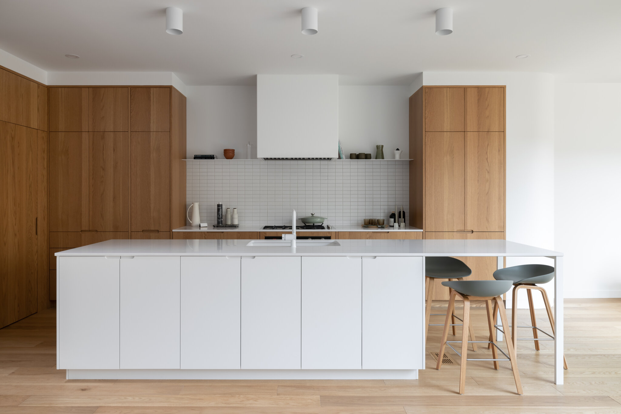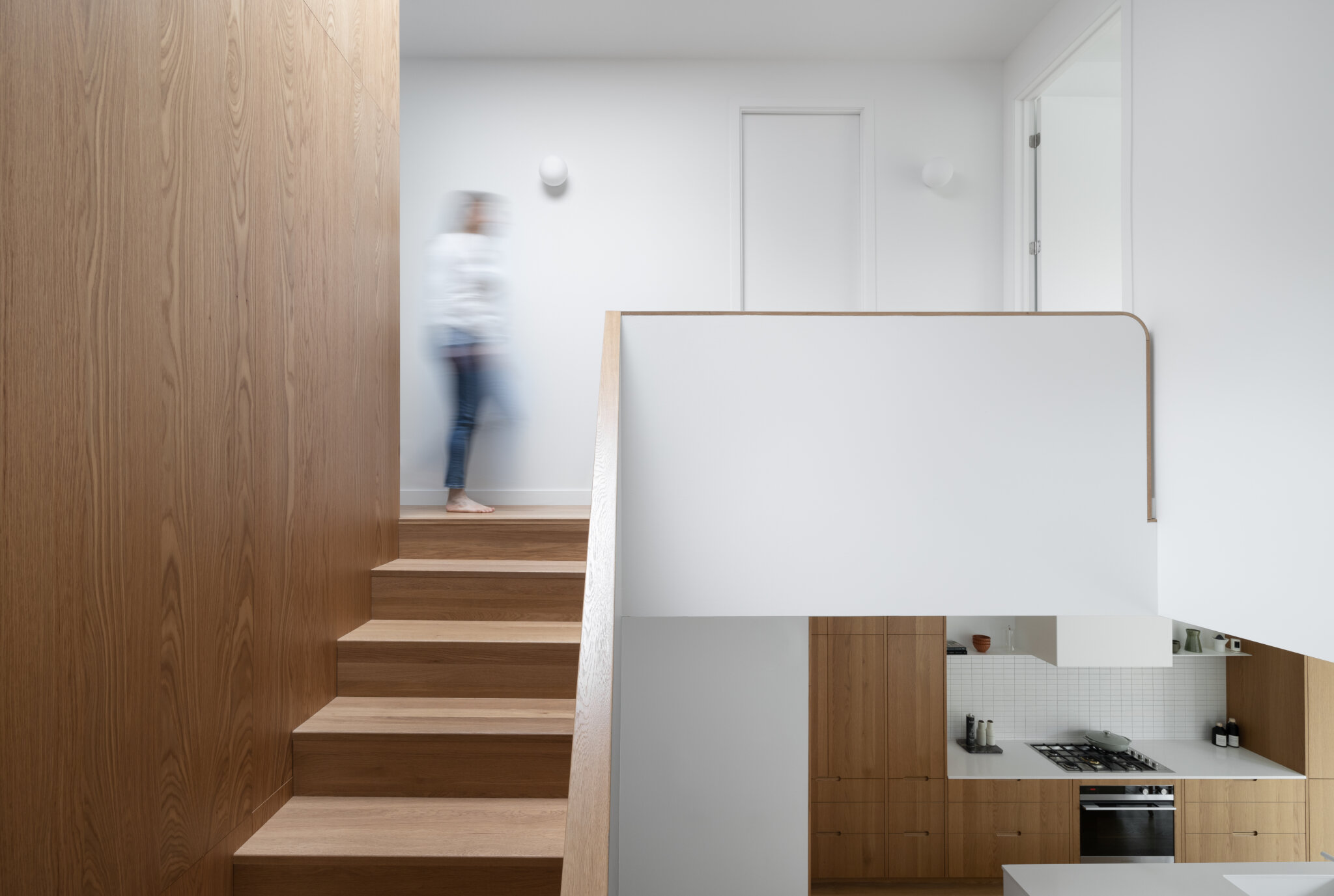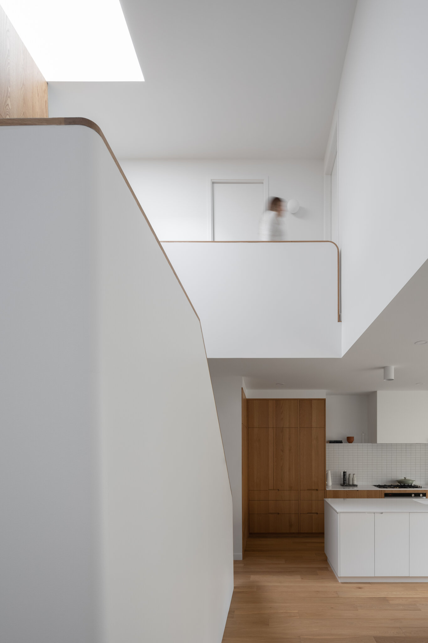 Au centre de la résidence se retrouve un escalier majestueux. Son enveloppe blanche agit comme pièce d’art dans l’espace, tandis que le noyau en bois contrastant et chaleureux évoque le parcours entre tous les niveaux du projet.