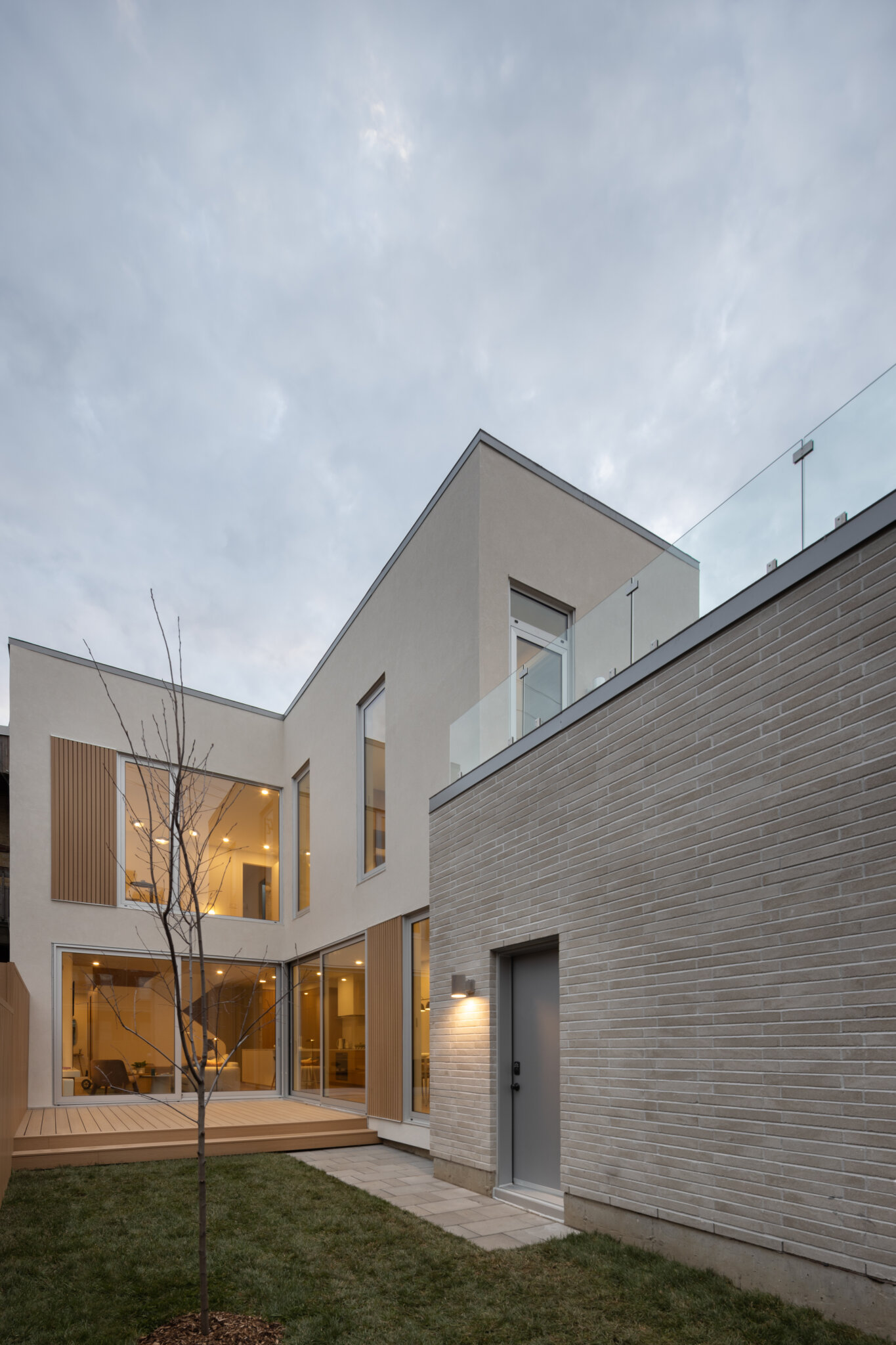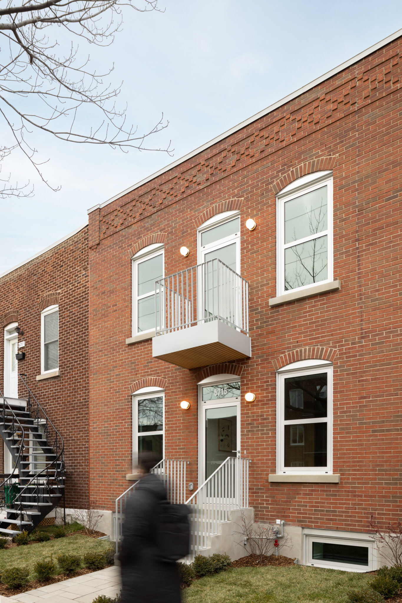Localisé dans un secteur patrimonial, la façade a complètement été rénovée, tout en respectant la typologie du duplex d’autrefois. L’implantation existante du bâtiment fut également conservée offrant un aménagement en forme de ‘’L’’ dans la résidence. Cette configuration offre une cour intime enveloppée par le cadre bâti. Afin de créer un contraste avec la façade de brique rouge, l’arrière se démarque par une façade blanche comprenant de grandes ouvertures.