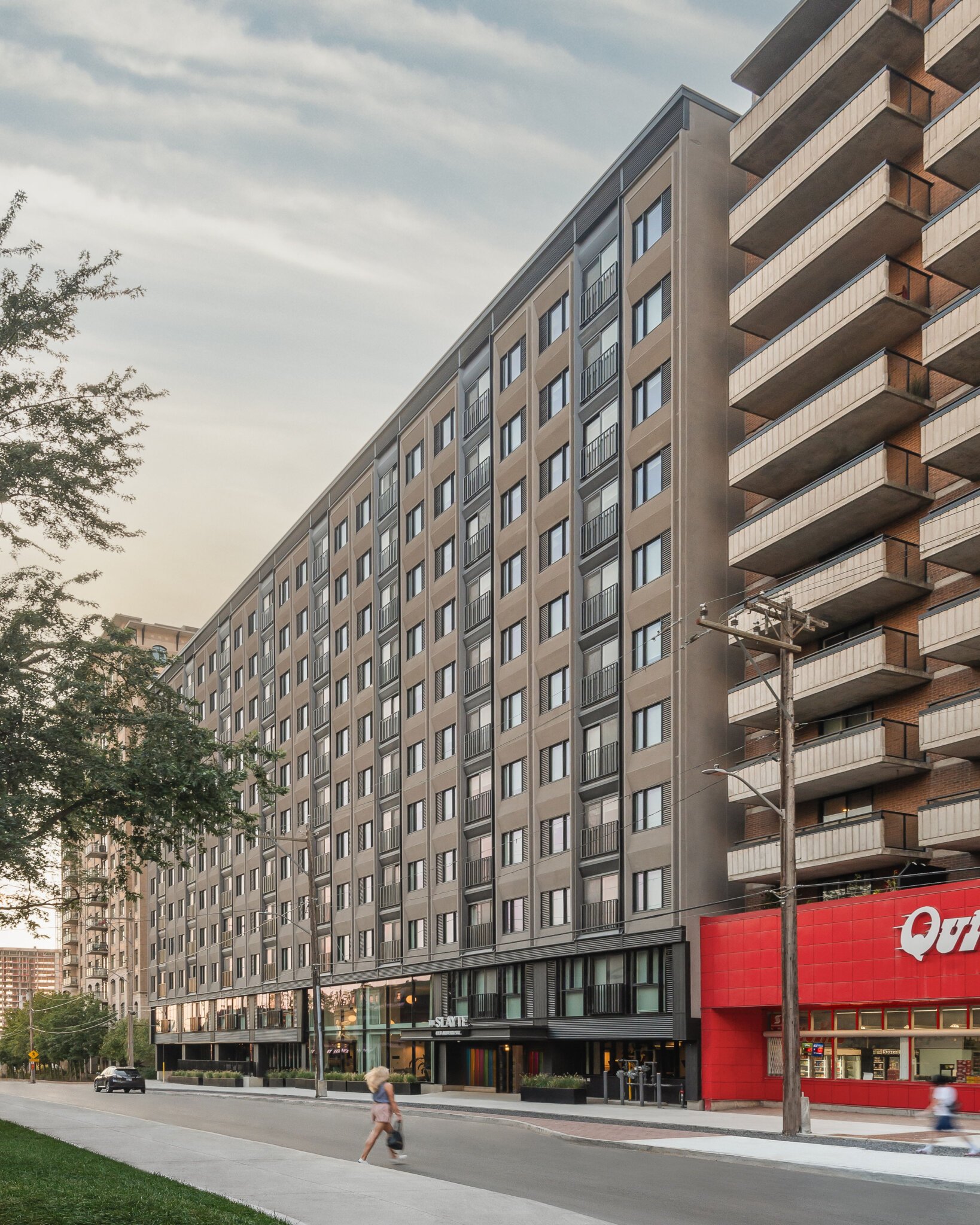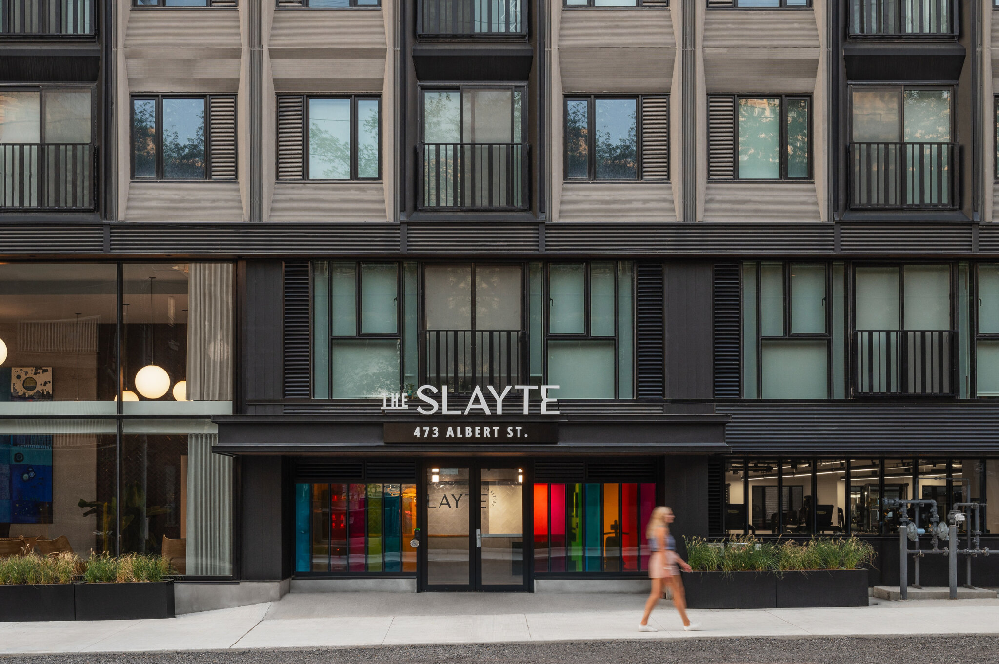 Construit en 1970, ce bâtiment post-moderniste de 11 étages situé dans le centre-ville d’Ottawa était inoccupé depuis des années. Ce joyau est doté de panneaux emblématiques en béton préfabriqué qui confèrent à la “peau” extérieure un caractère unique. La conversion d’un bâtiment vide et existant en quelque chose d’utile est un geste durable de premier ordre. Cette entreprise de grande envergure fournit 158 unités de logement dont on avait grand besoin, tout en redonnant vie au centre-ville. En réutilisant la structure en béton existante et en préservant les panneaux préfabriqués en béton, on a évité l’émission de 4575 tonnes de carbone ; une solution pratique et efficace pour réduire le carbone et construire un avenir plus durable. Avec un hall d’entrée de deux étages, d’incroyables espaces d’agrément pour les locataires et la proximité d’options de transport durable, The Slayte se positionne avec succès en abordant de nombreuses questions pressantes de notre époque, d’une manière élégante.