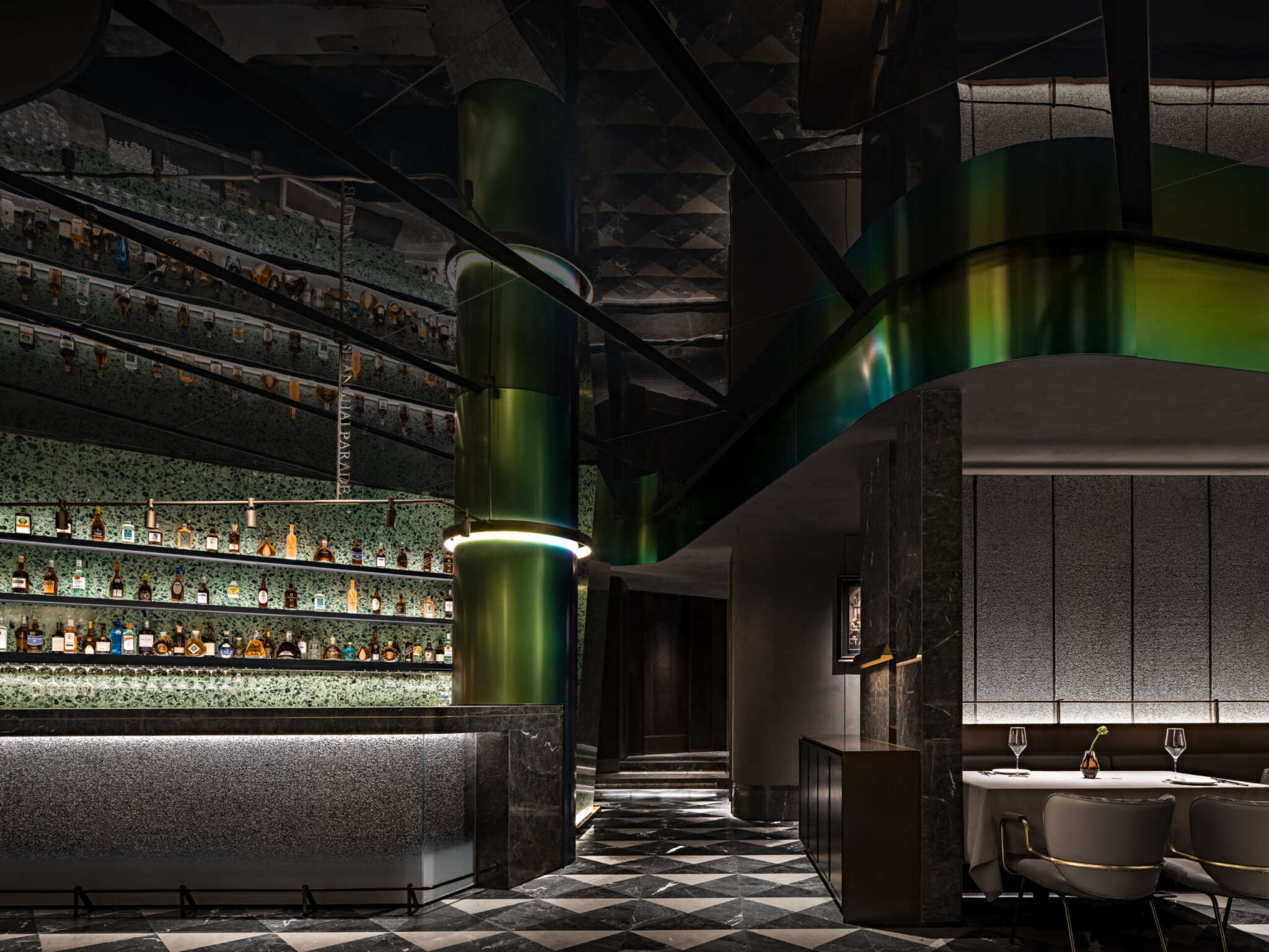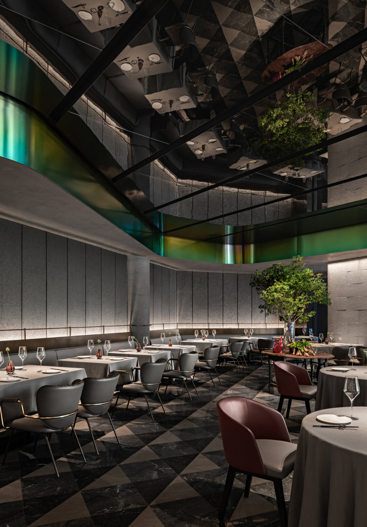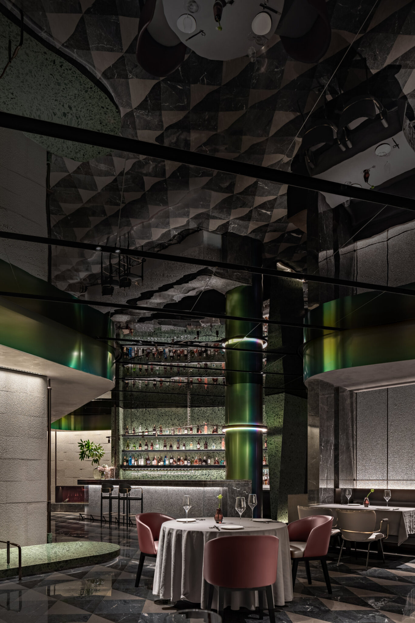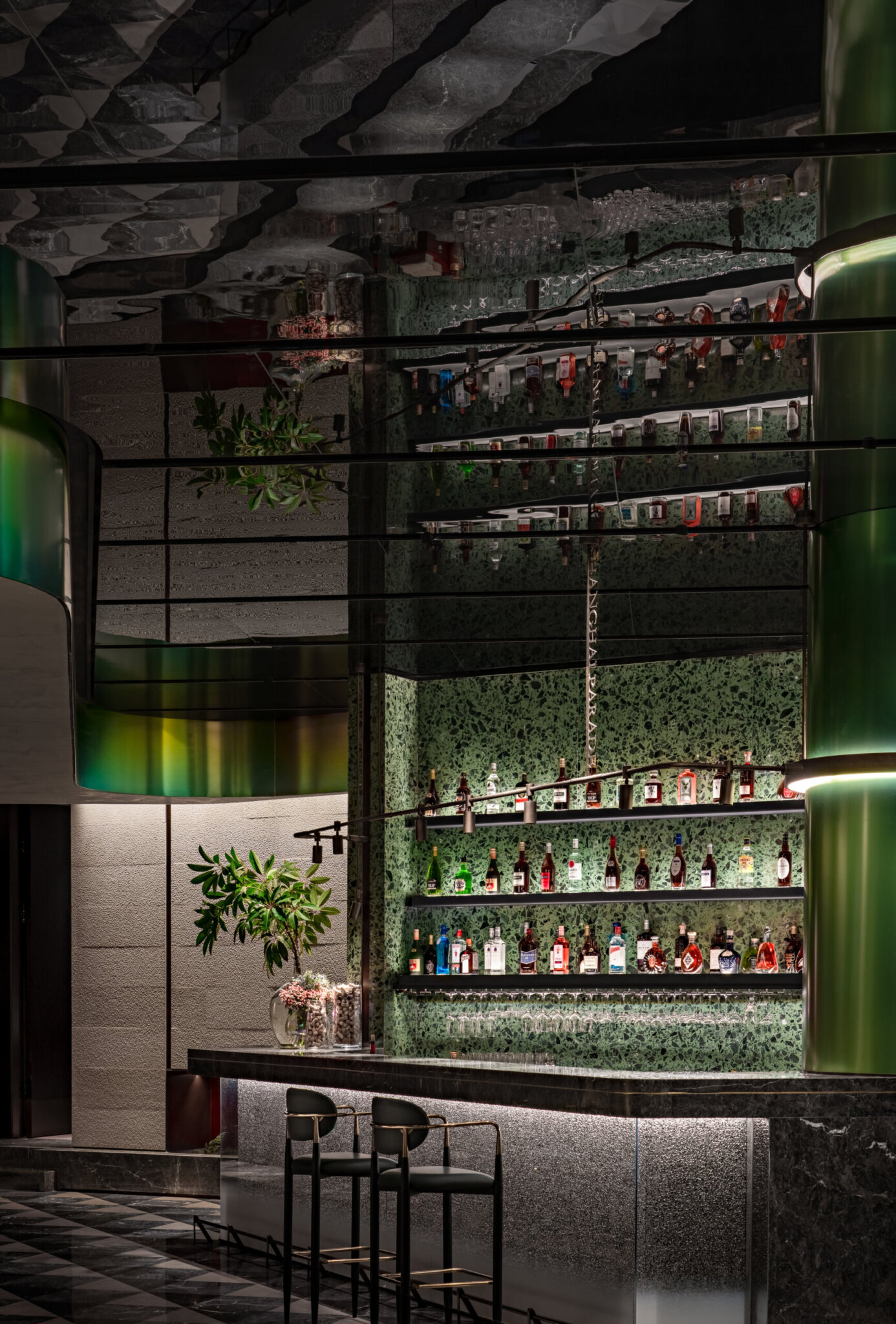 Le bar circulaire utilise la forme globale de la salle, tout en gommant l’irrégularité de l’établissement, le faisant ressembler à une île dans l’eau. Les clients ne sont pas en mesure de percer ses secrets, mais ils peuvent les découvrir tant qu’ils voyagent avec le courant. La lumière et le brouillard se déplacent le long du mur, tandis que le terrazzo vert et les blocs gris reflètent les lumières éblouissantes. Le plafond a effacé les frontières au-dessus de la tête, et les piliers en acier inoxydable renforcent encore l’impression futuriste de la vue. La froideur moderne a été affectée par le flux de couleurs, qui met en valeur les caractéristiques humaines.