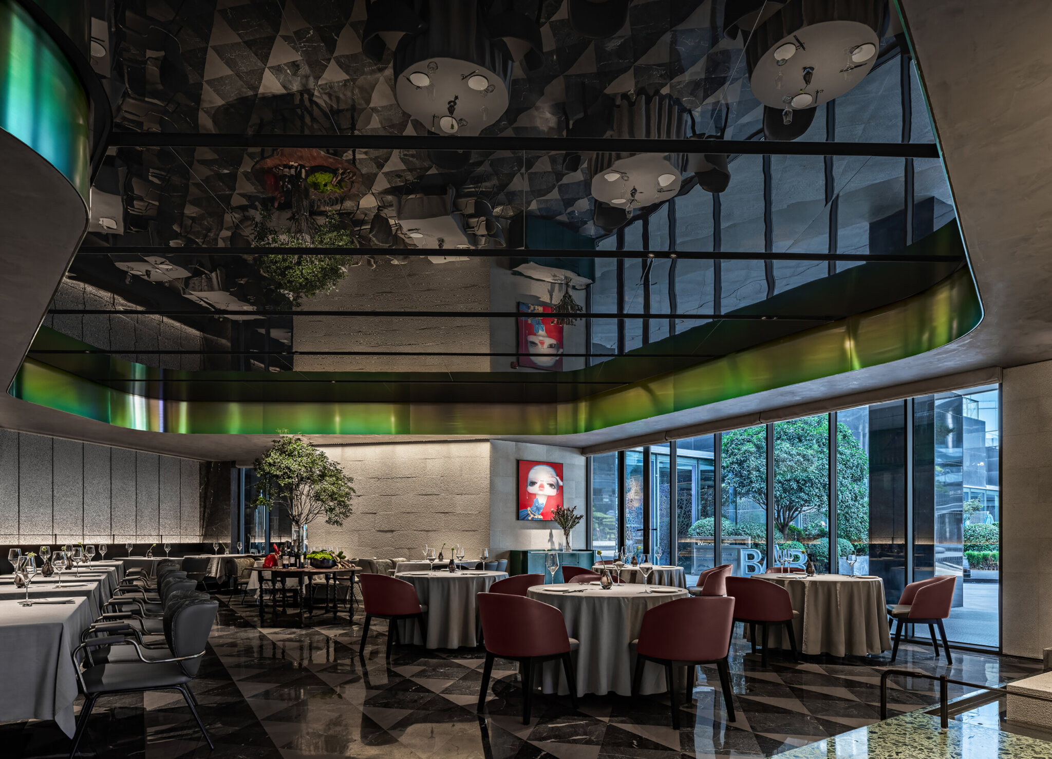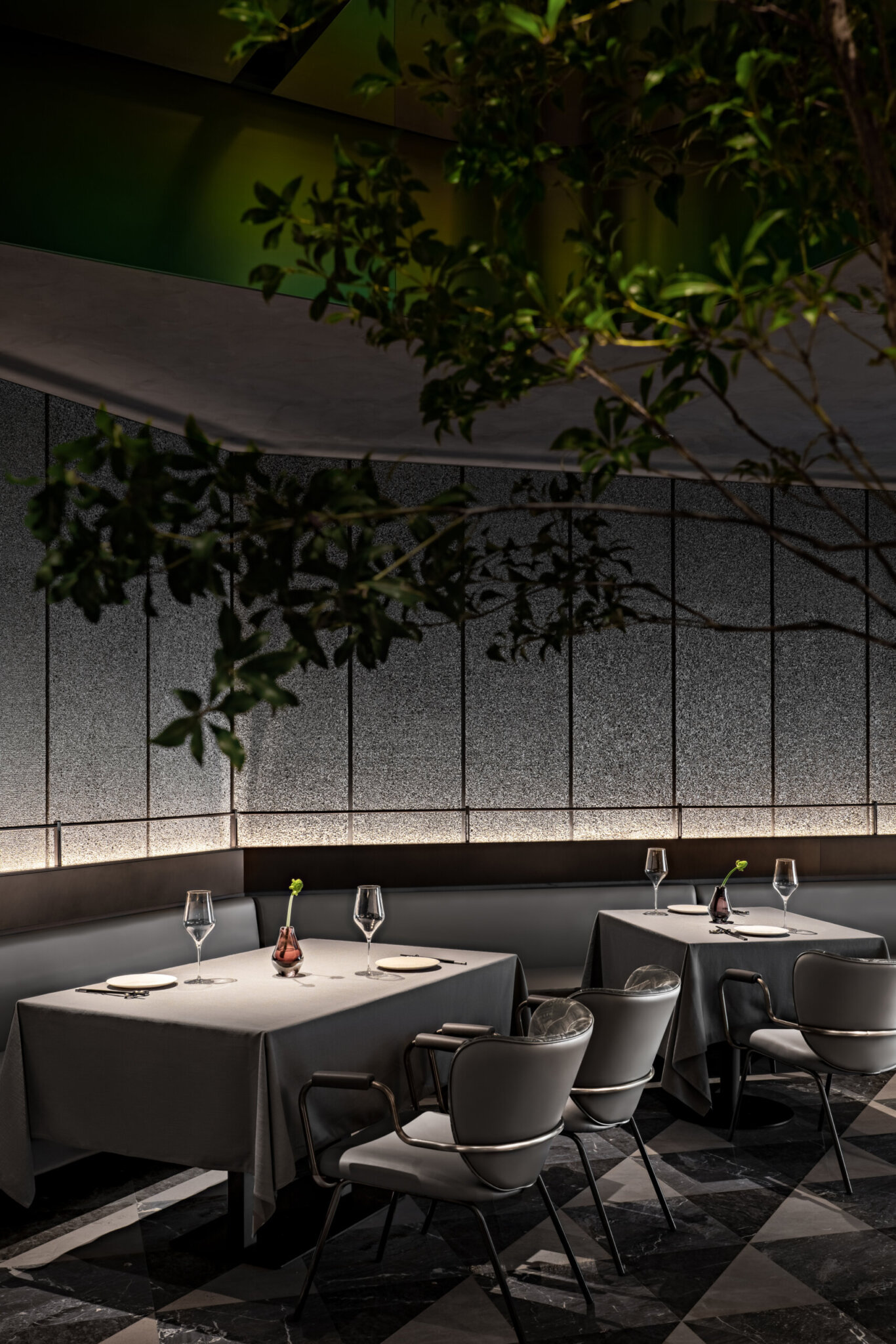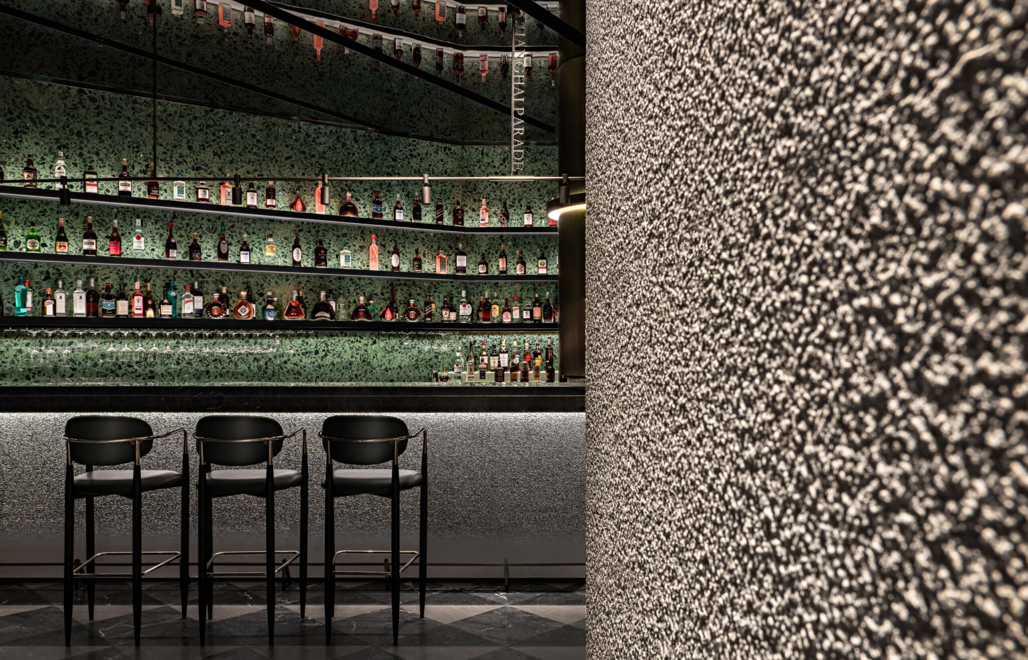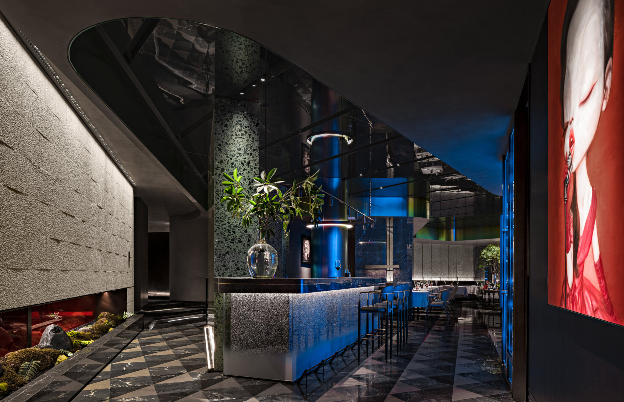 Le bar circulaire utilise la forme globale de la salle, tout en gommant l’irrégularité de l’établissement, le faisant ressembler à une île dans l’eau. Les clients ne sont pas en mesure de percer ses secrets, mais ils peuvent les découvrir tant qu’ils voyagent avec le courant. La lumière et le brouillard se déplacent le long du mur, tandis que le terrazzo vert et les blocs gris reflètent les lumières éblouissantes. Le plafond a effacé les frontières au-dessus de la tête, et les piliers en acier inoxydable renforcent encore l’impression futuriste de la vue. La froideur moderne a été affectée par le flux de couleurs, qui met en valeur les caractéristiques humaines.