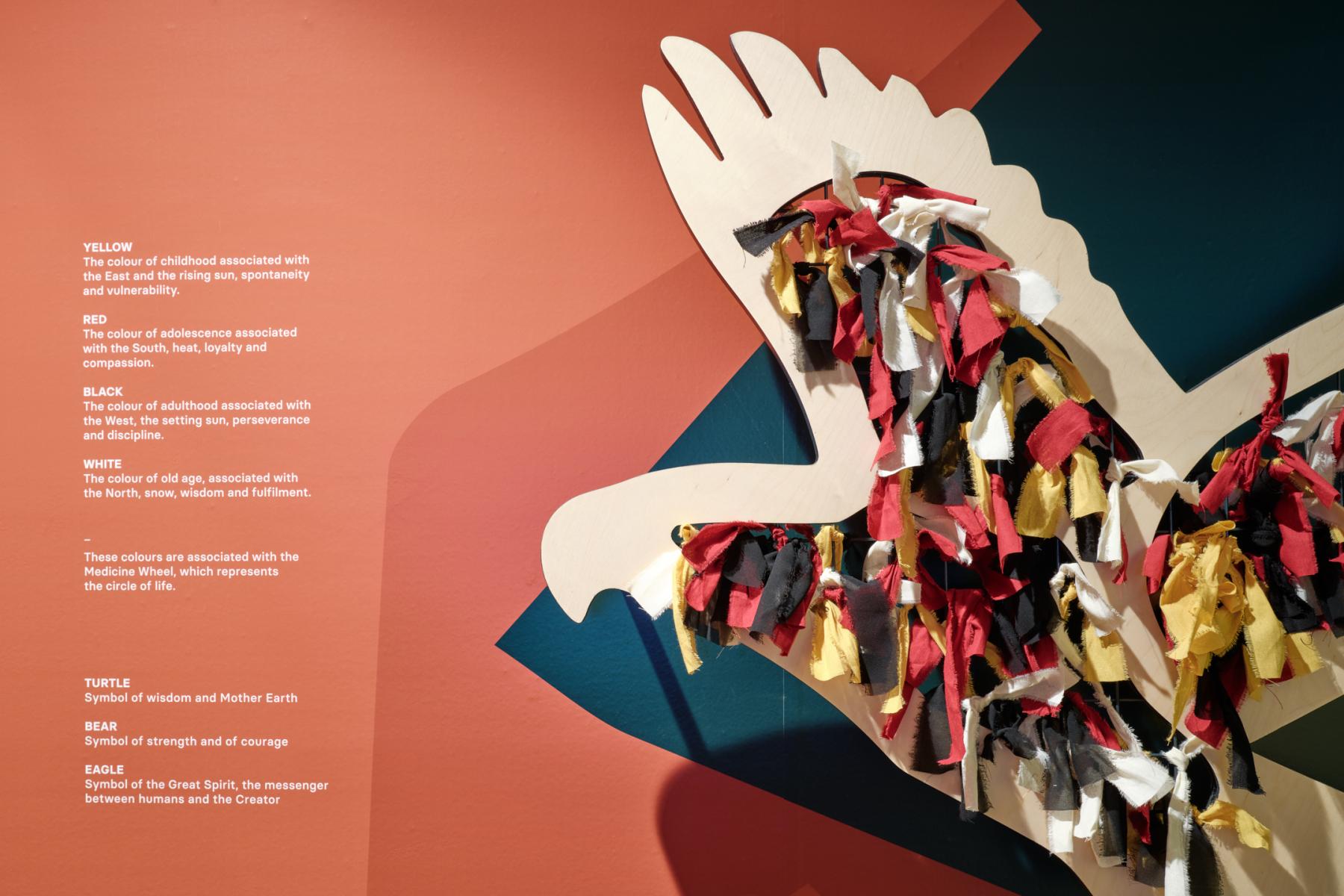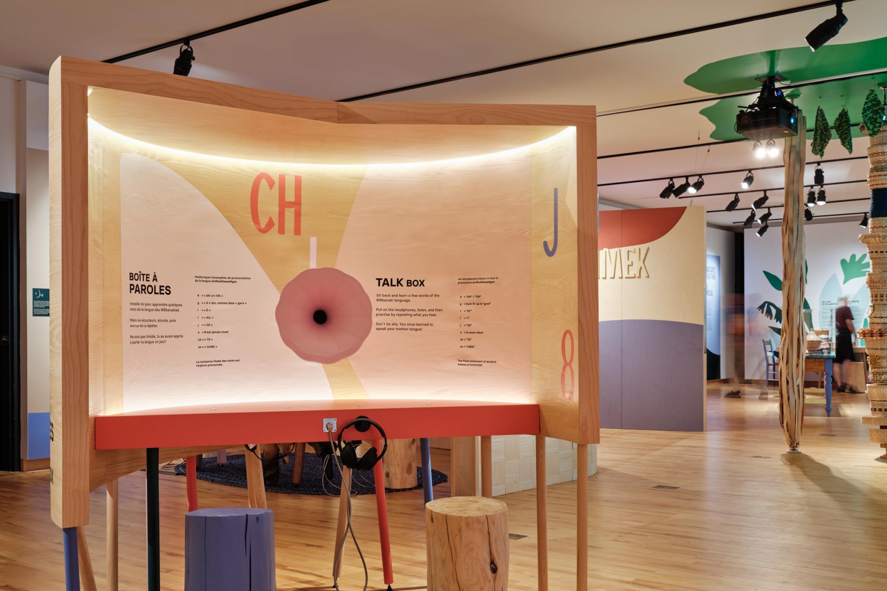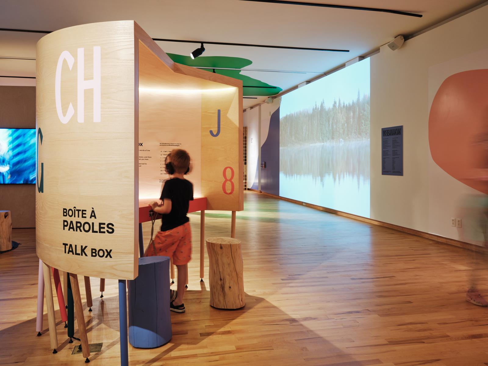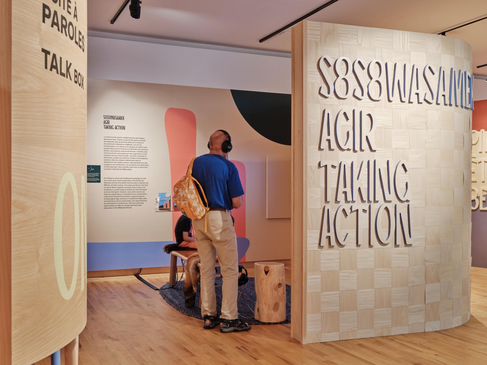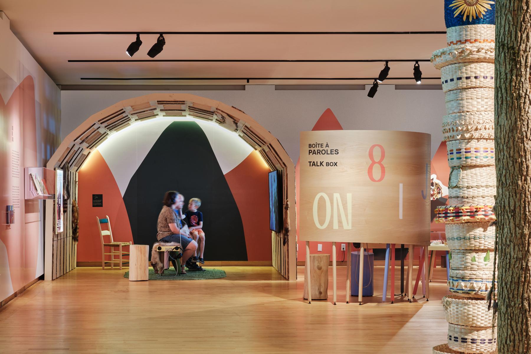 Soulignons qu’avant le démarrage du projet, un important processus de consultation, sous la forme d’ateliers de partage, avait eu lieu auprès des membres des communautés d’Odanak et de W8linak. Ce processus a permis de déterminer les lignes directrices envisagées pour la future exposition : objectifs, messages, fil conducteur, thèmes et objets significatifs. C’est sur la base de cette précieuse démarche que la firme a pu débuter son travail d’idéation en proche collaboration avec les personnes-ressources associées au projet (personnel du Musée, membres du C.A. et de la communauté).