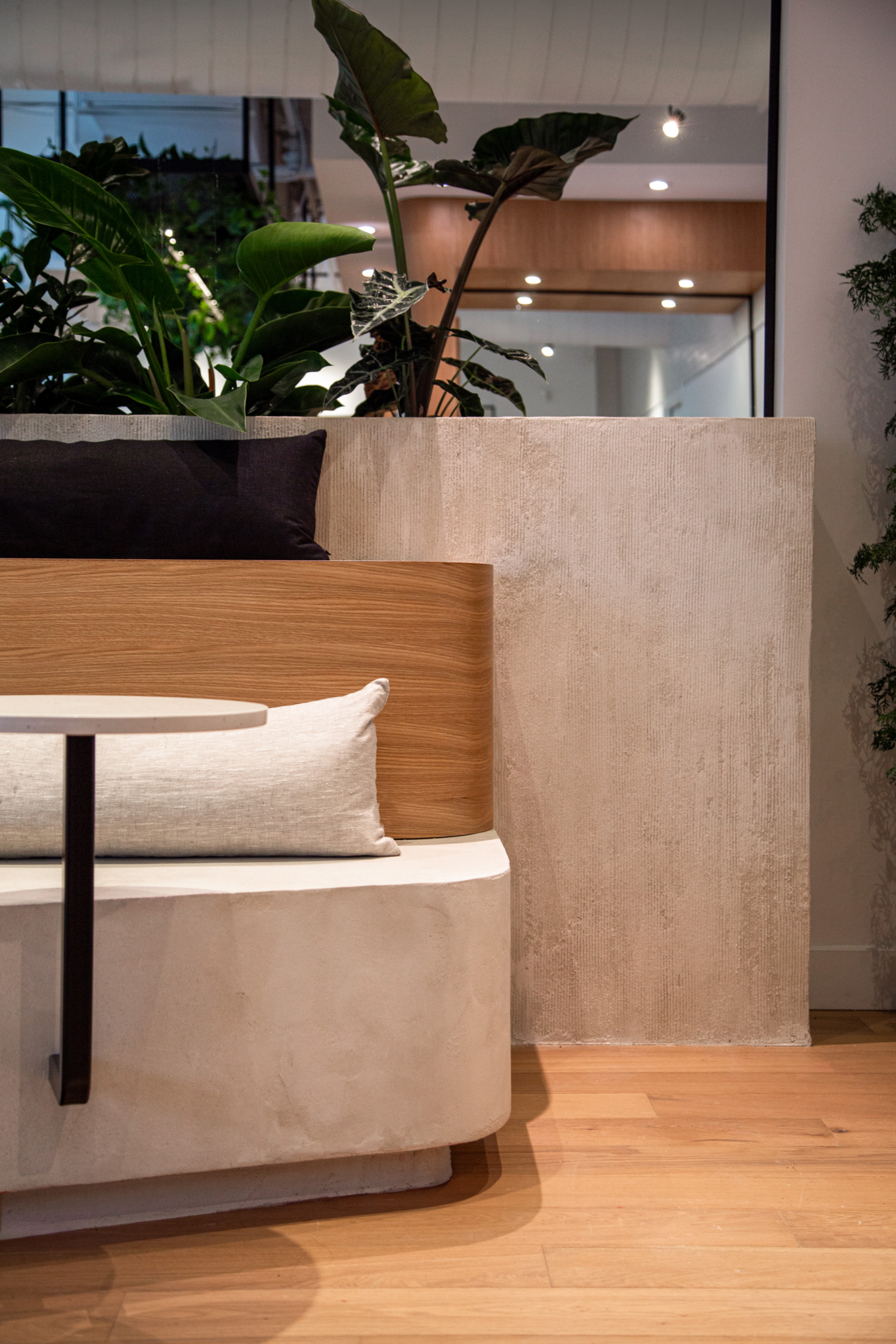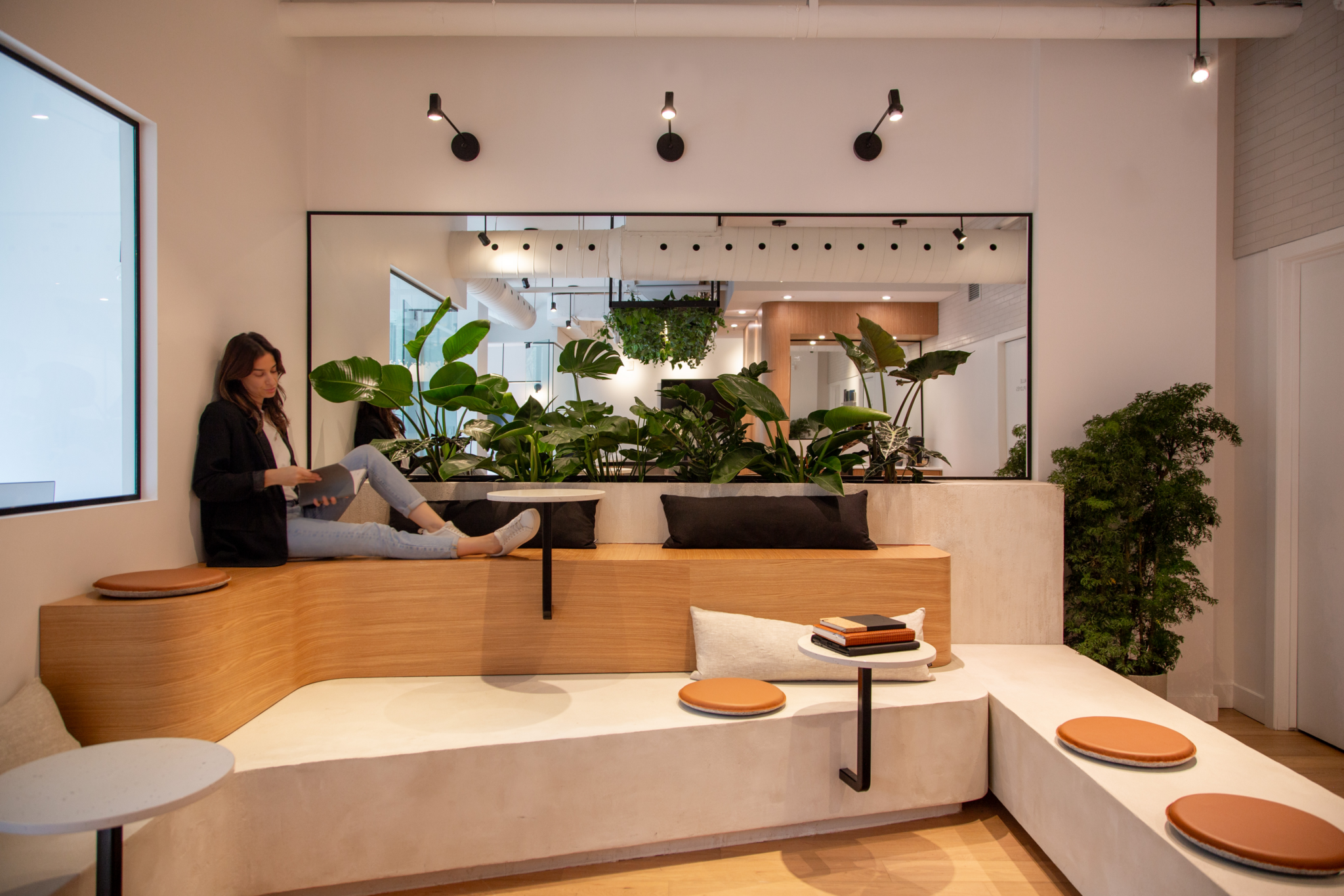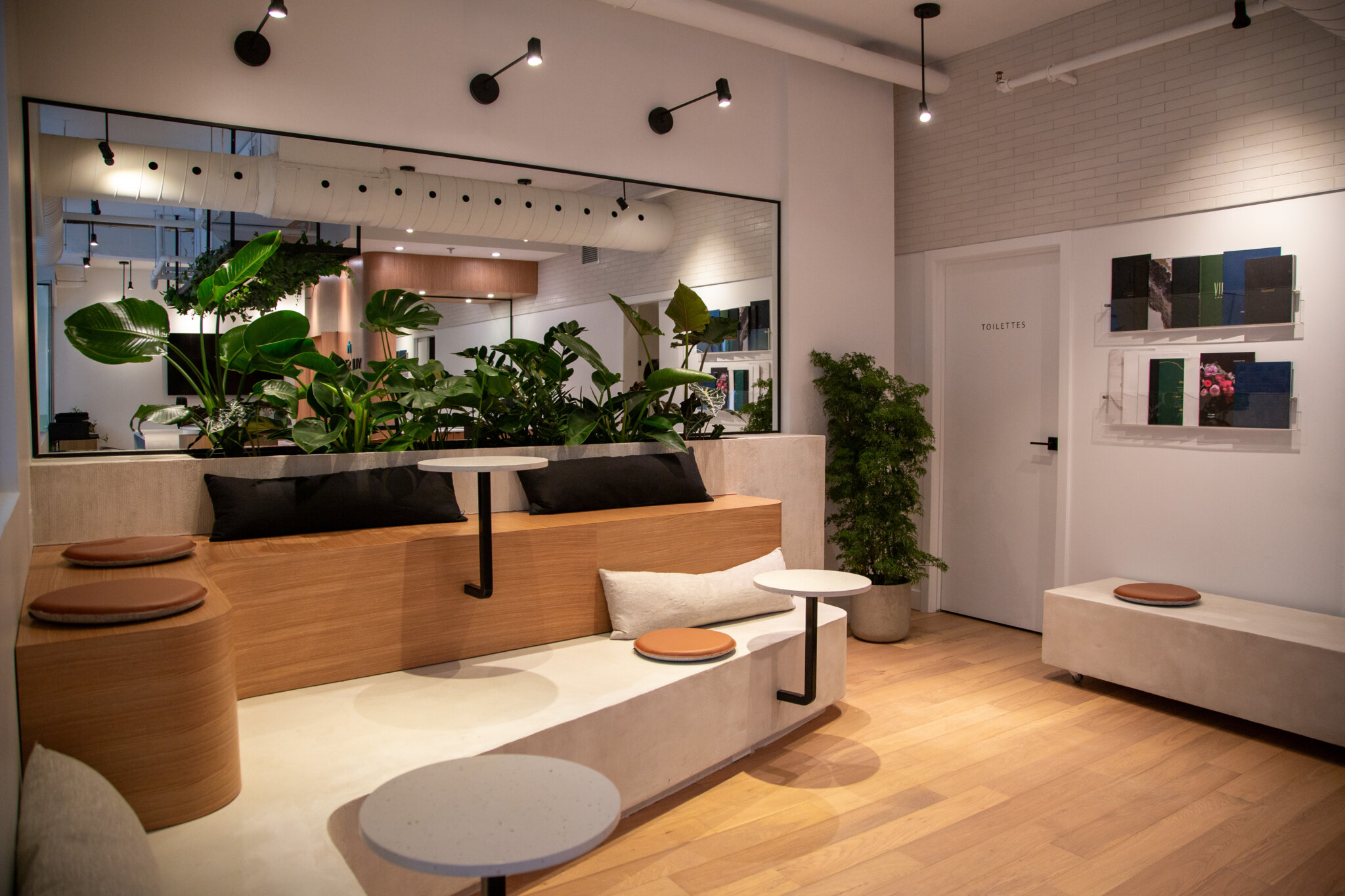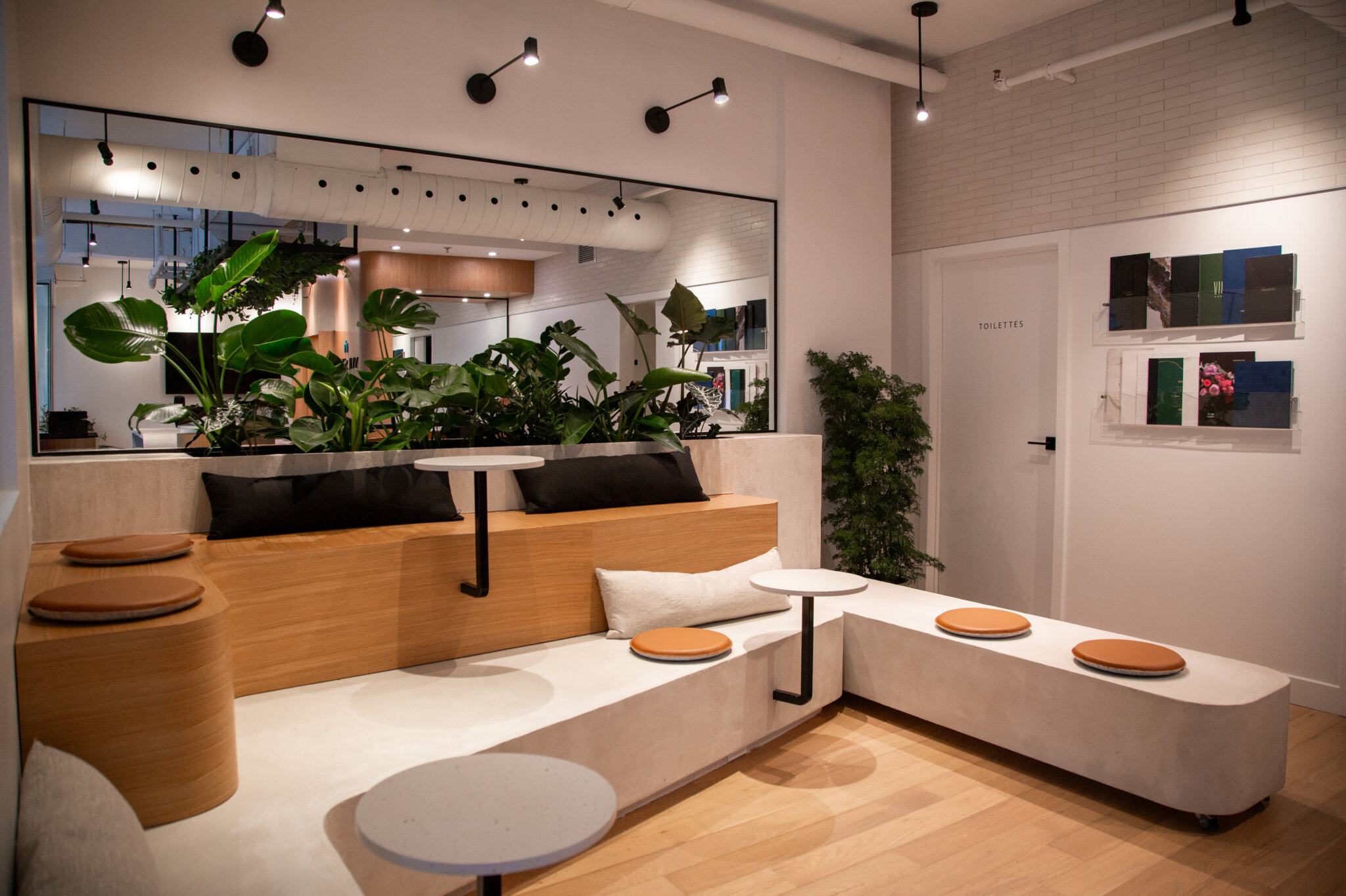 Une section lounge a été aménagée avec une banquette sur deux niveaux qui peut être utilisée comme lieu de détente par les employés, mais également comme espace de travail informel. D’abord prévue pour résoudre une problématique d’accessibilité universelle, une banquette supplémentaire a été astucieusement intégrée, afin d’être déplacée au besoin et rendre l’espace modulable.
