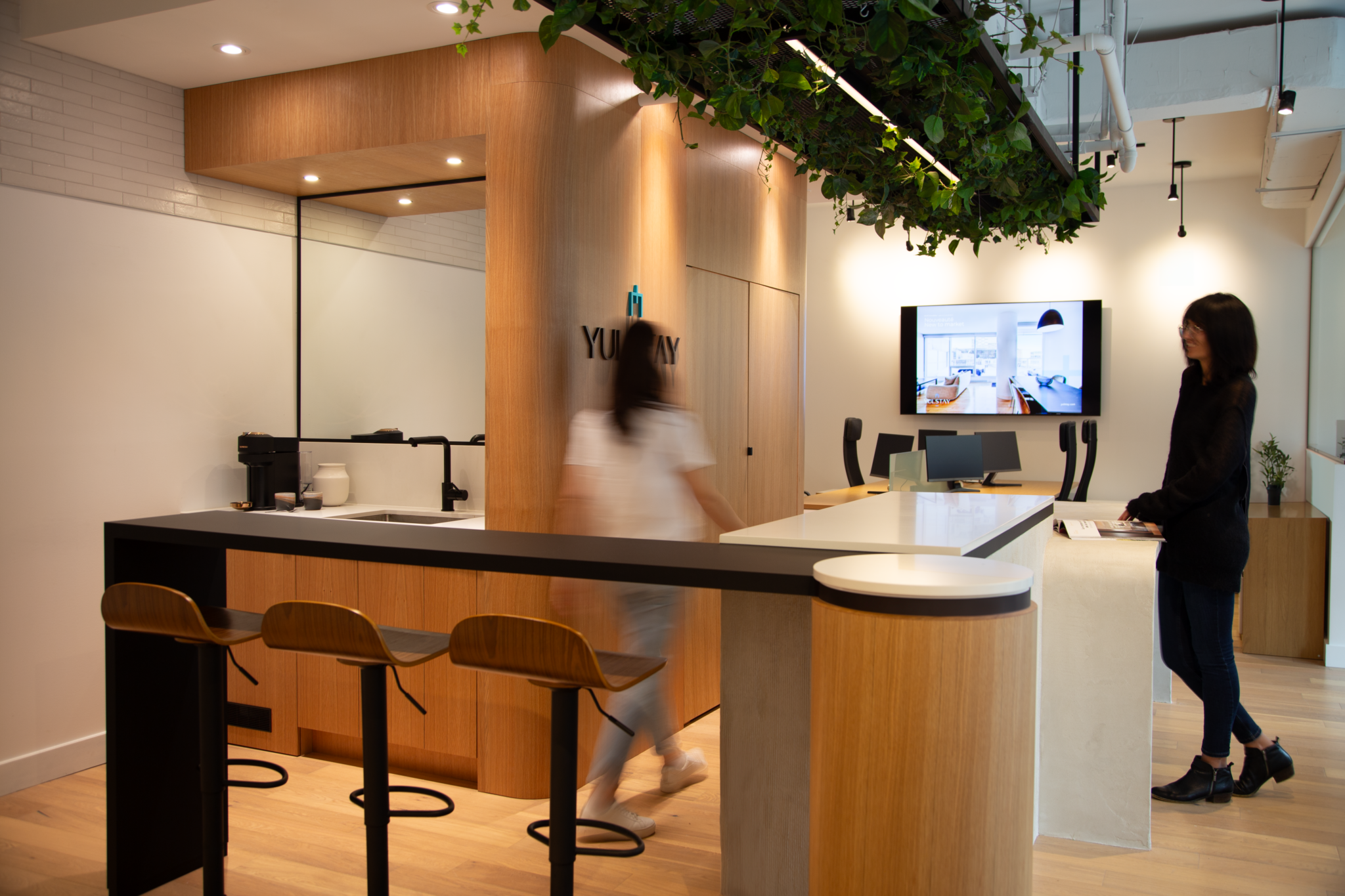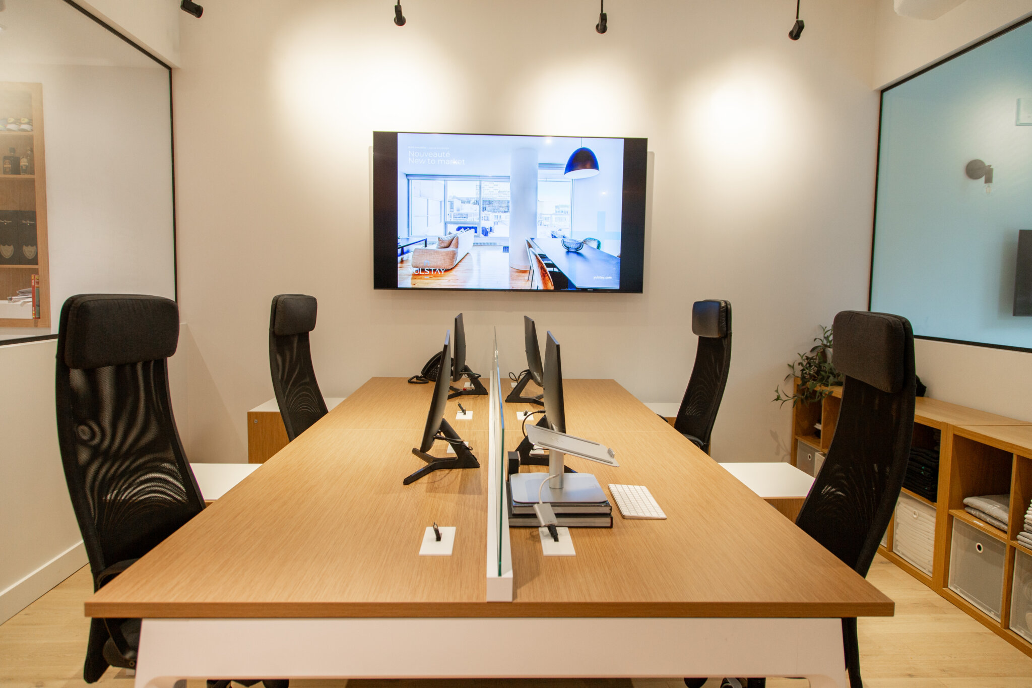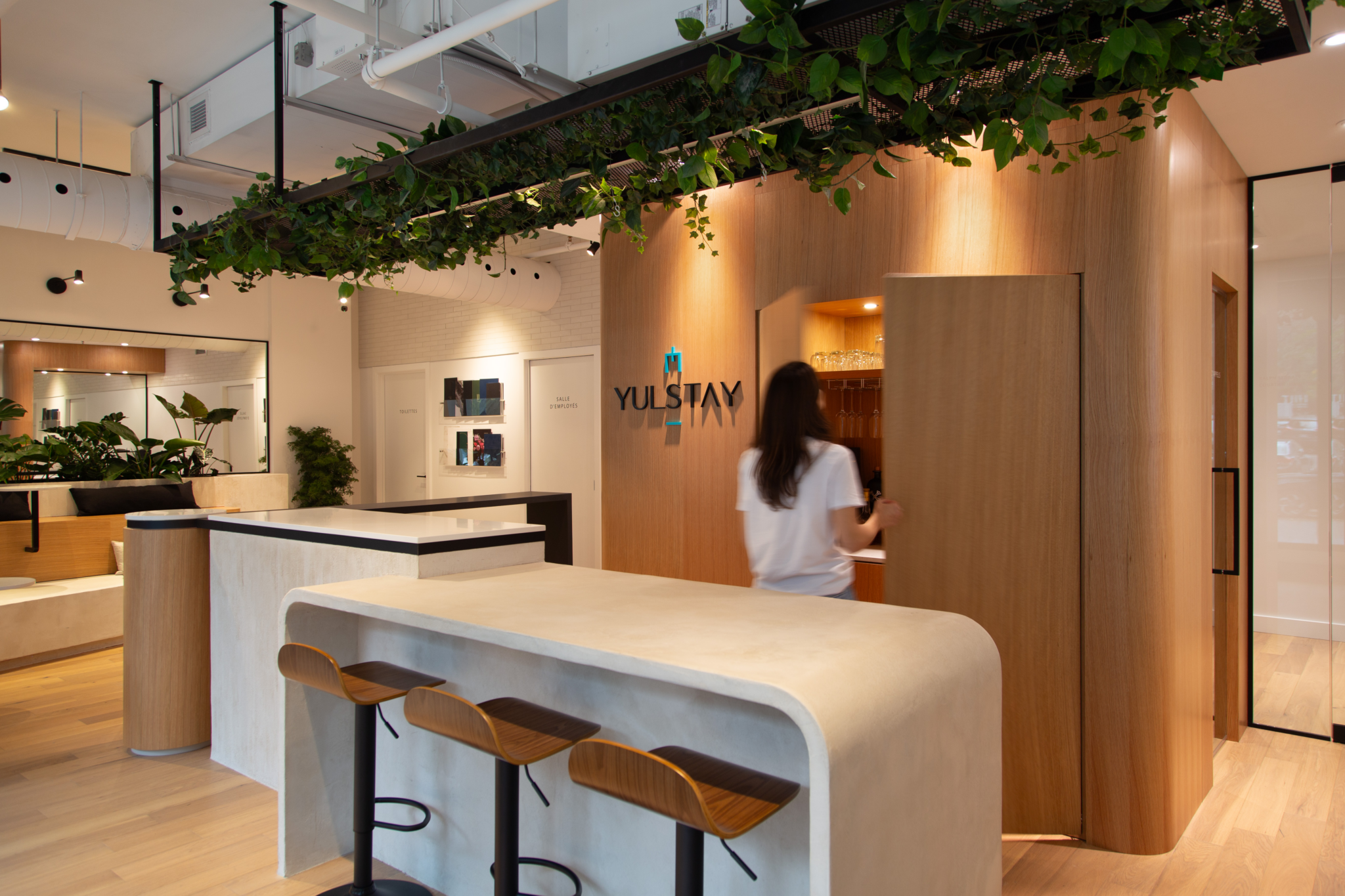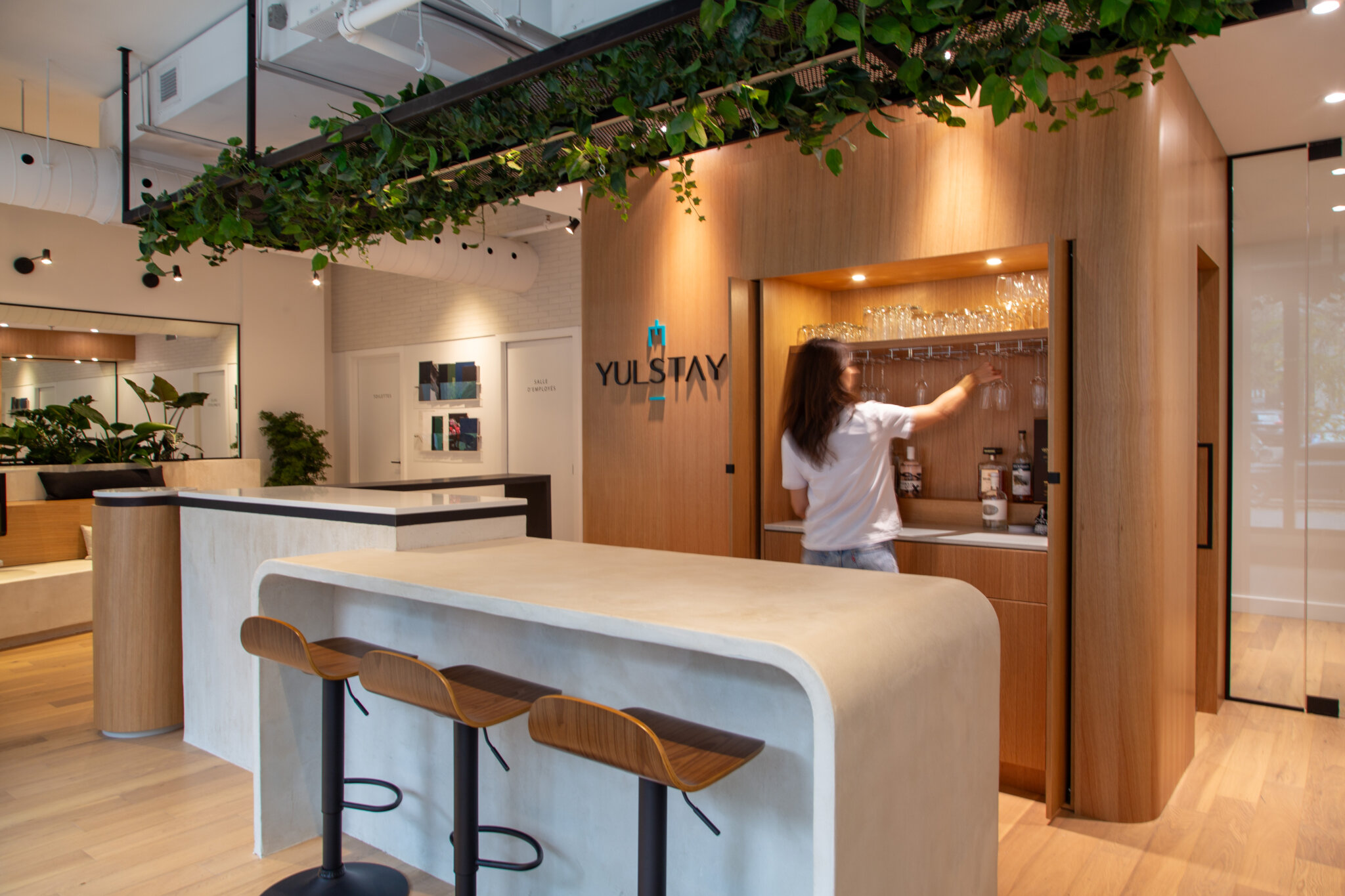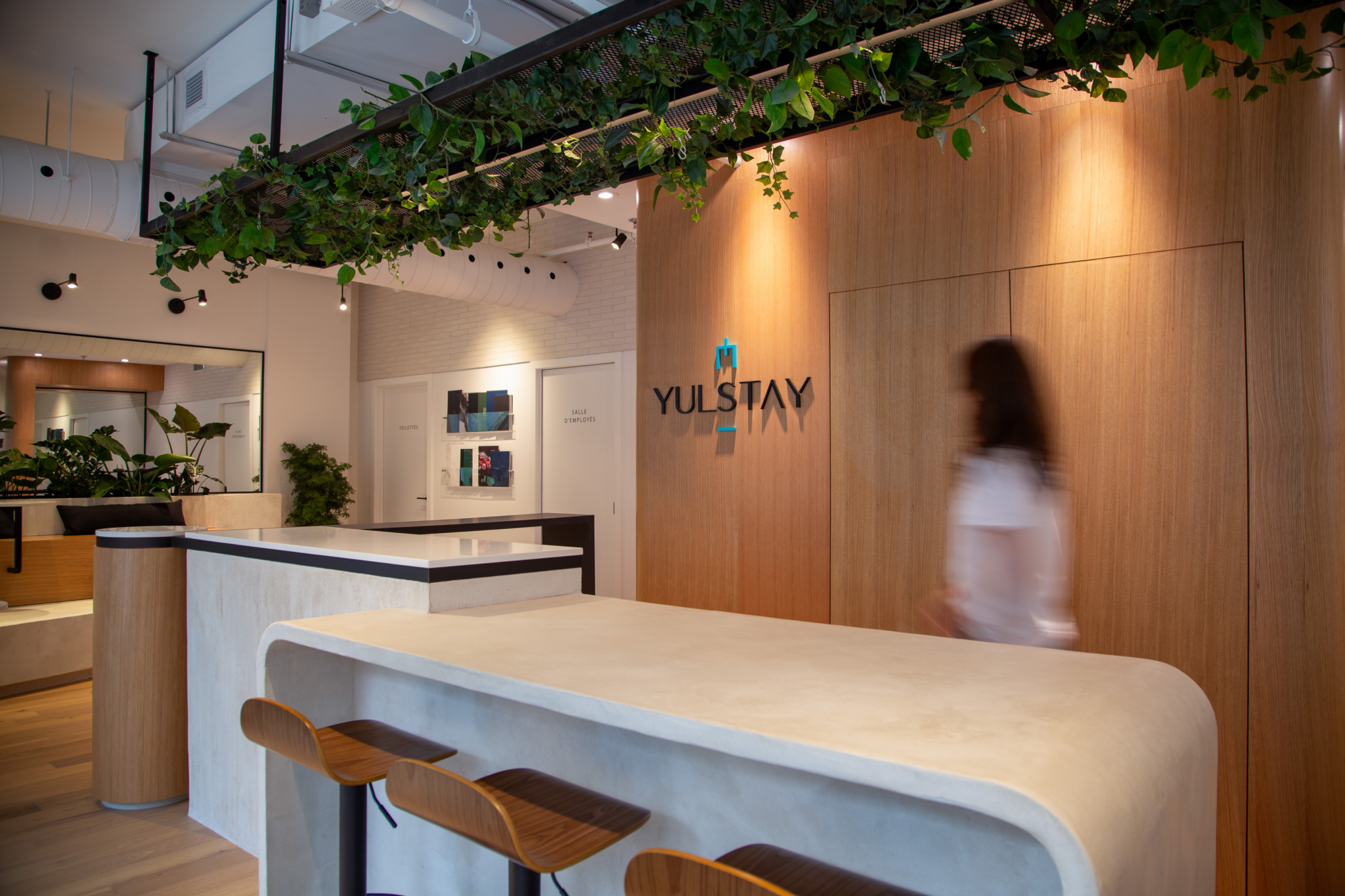 Le projet Yulstay consiste en une réorganisation d’un local commercial de 1100 pi.ca, situé au rez-de-chaussée d’une tour à condos dans le Vieux-Montréal. Le but de cette transformation était de revoir l’aménagement du local, qui était initialement l’unité modèle du projet de condos. L’objectif premier était donc de planifier un espace de travail adapté aux besoins d’une équipe de courtiers et conseillers immobiliers, qui saurait refléter l’image de l’entreprise.