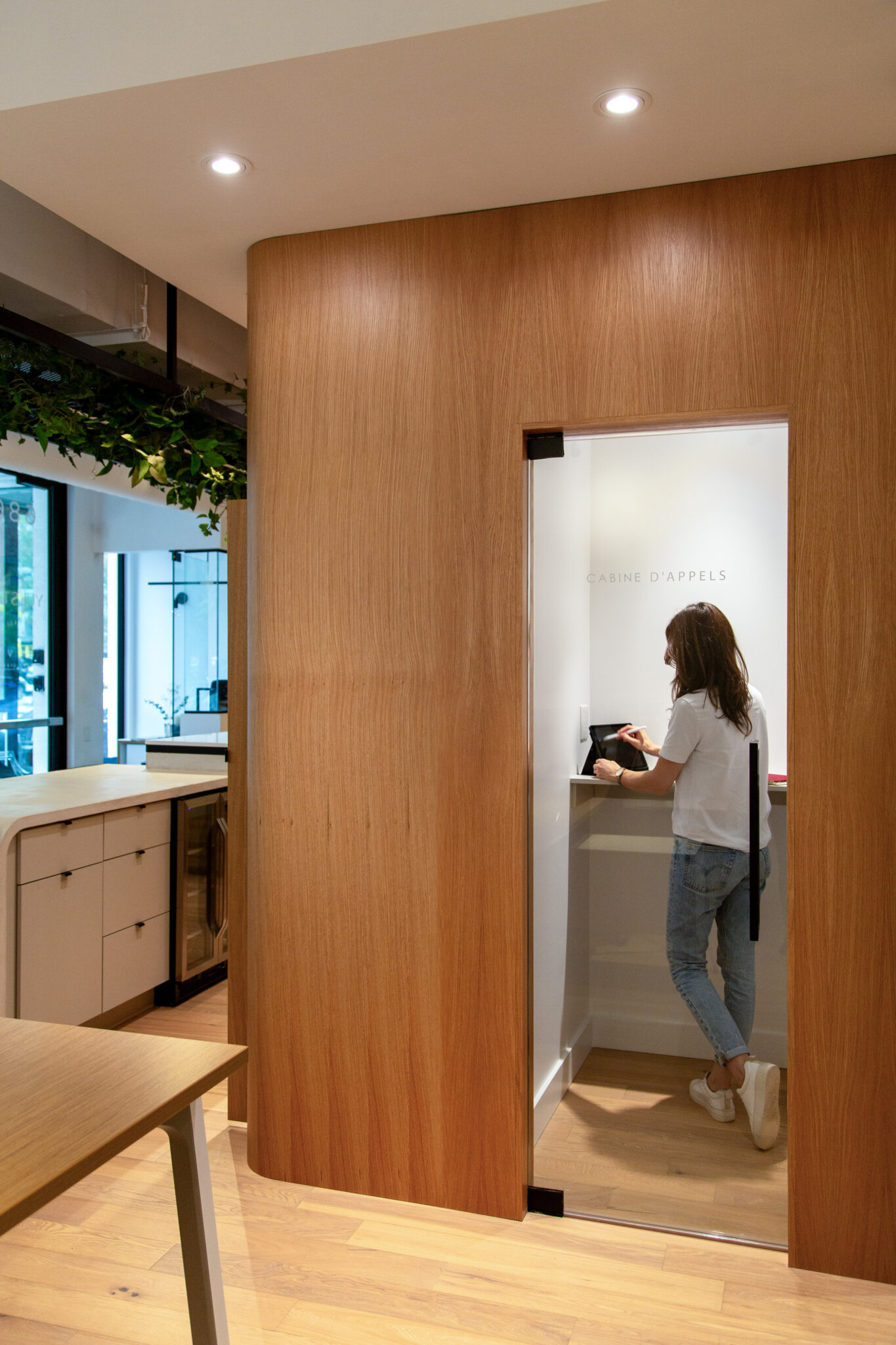 Le mobilier intégré dans les différentes zones a lui aussi été réfléchi, afin de correspondre aux besoins de versatilité de l’équipe. Le point de départ de l’aménagement fut d’ailleurs le bloc central en placage de bois, autour duquel les différentes zones s’organisent. Pilier central de l’aménagement, il intègre à la fois une cabine d’appel, un coin café, en plus d’un rangement dissimulé en façade.