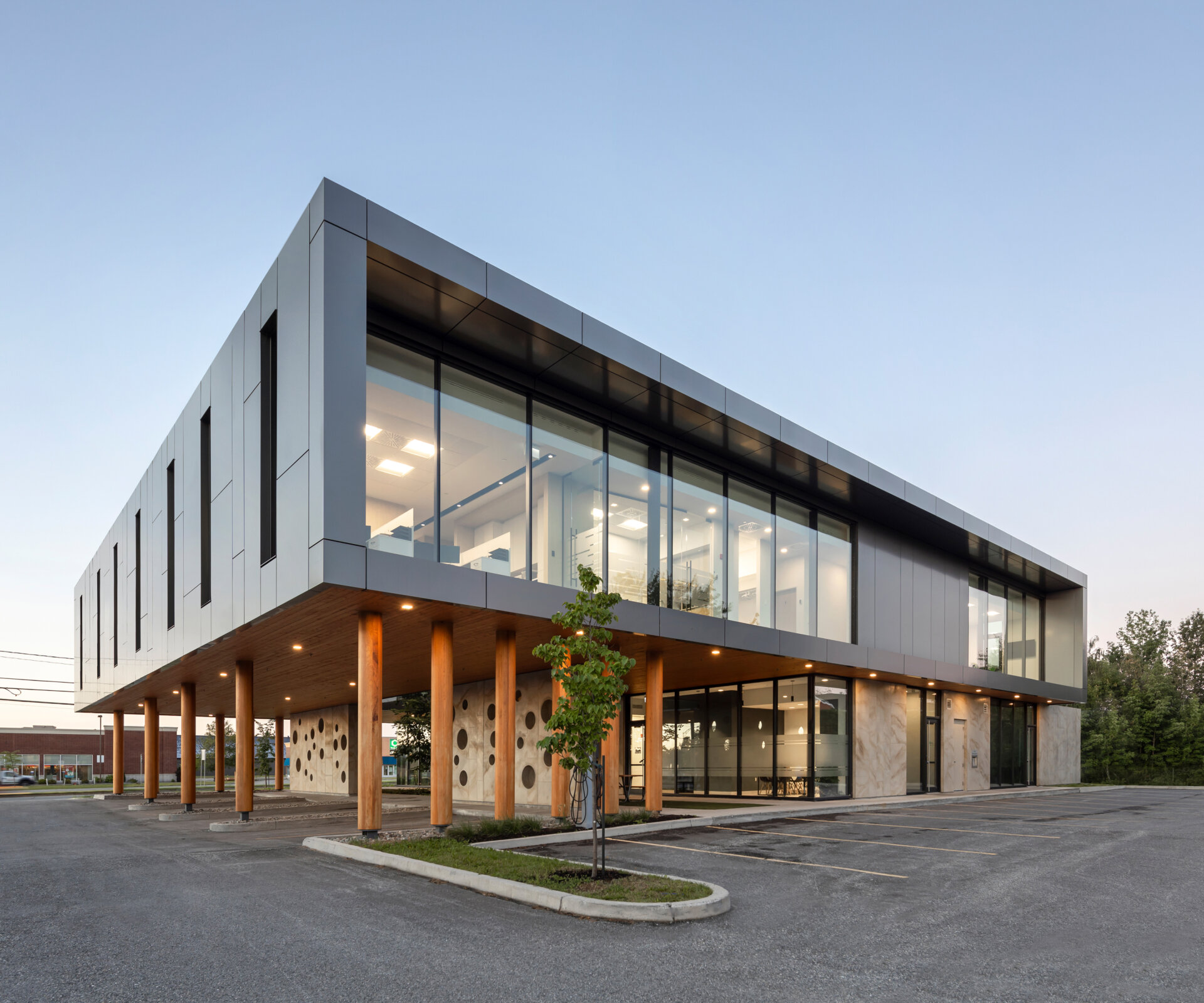 Couvrant 13 800 pi2 sur deux étages, l’édifice du 5035 boulevard Bourque à Sherbrooke a été conçu pour accueillir les bureaux du propriétaire et des espaces locatifs. En plus de la conception, Équipe A a réalisé le design intérieur, incluant les choix de finis, le mobilier intégré, l’éclairage et la signalisation intérieure et extérieure.
